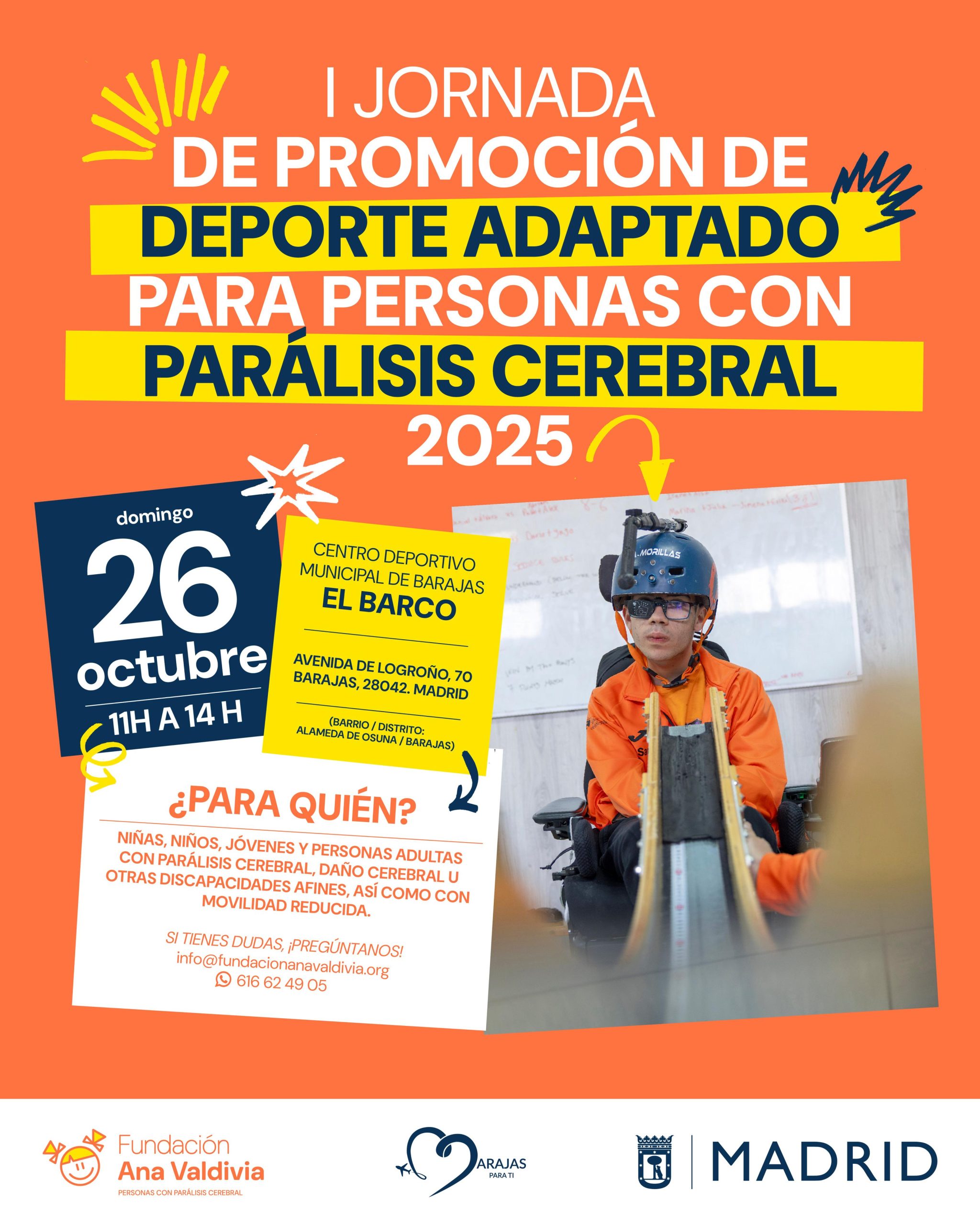 Desde Fundación Ana Valdivia, y en colaboración con la Junta Municipal del Distrito de Barajas y el Ayuntamiento de Madrid, te invitamos a participar en la I Jornada de Promoción de Deporte Adaptado para Personas con Parálisis Cerebral 2025, una actividad gratuita y abierta a todo publico pensada para acercar el deporte inclusivo a niñas, niños, jóvenes y personas adultas con parálisis cerebral, daño cerebral, otras discapacidades afines y también a personas con movilidad reducida.